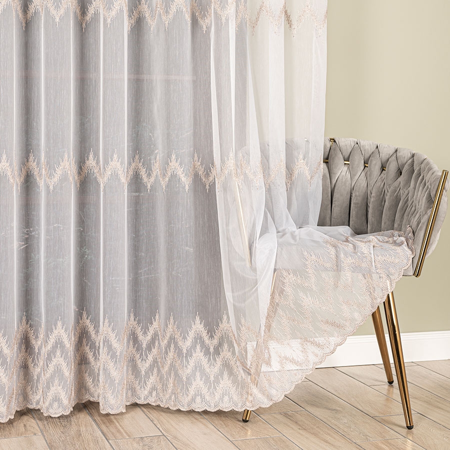 Lekka i zwiewna firana o wysokości 280 cm, wykonana z subtelnie połyskującej siateczki w kolorze écru, ozdobiona geometrycznym haftem - idealna ozdoba Twojego salonu