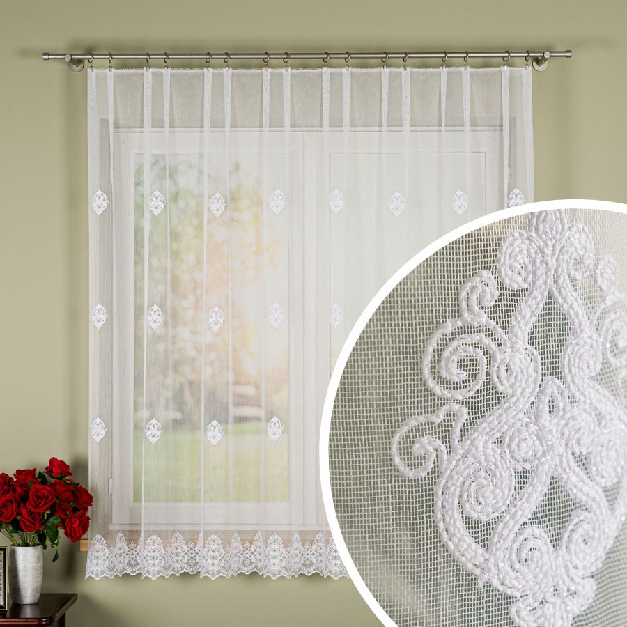 Długa firanka haftowana 300 cm – biała z błyskiem i wzorem pasowym na metry