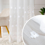Lekka Etamina i Unikalny Wzór 3D Firana została wykonana z wysokiej jakości białej etaminy – tkaniny cenionej za swoją lekkość i subtelną strukturę siateczki. Materiał delikatnie filtruje światło, nie zaciemniając pomieszczenia, a jednocześnie zapewniając poczucie prywatności. Główną ozdobą są precyzyjnie haftowane kwiaty 3D, w których centrum umieszczono delikatną, połyskującą perełkę. Ten trójwymiarowy detal przyciąga wzrok i dodaje całości luksusowego charakteru.