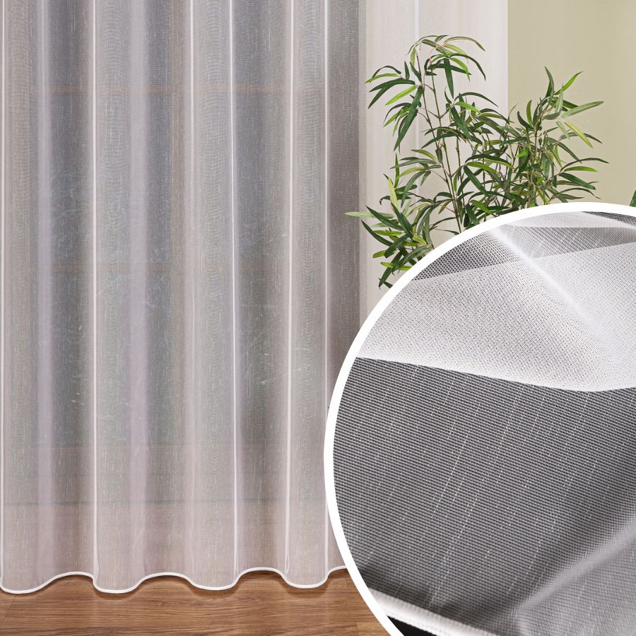 Firana wykonana z lekkiego, półprzezroczystego poliestru (100%) w czystej bieli, z bogatym haftem liściastym i koronkowymi akcentami na brzegach. Wysokość 250 cm (regulowana), szerokość na metry – łatwe dopasowanie do salonu, jadalni czy sypialni. Nie wymaga prasowania, łatwa w praniu, odporna na codzienne użytkowanie.