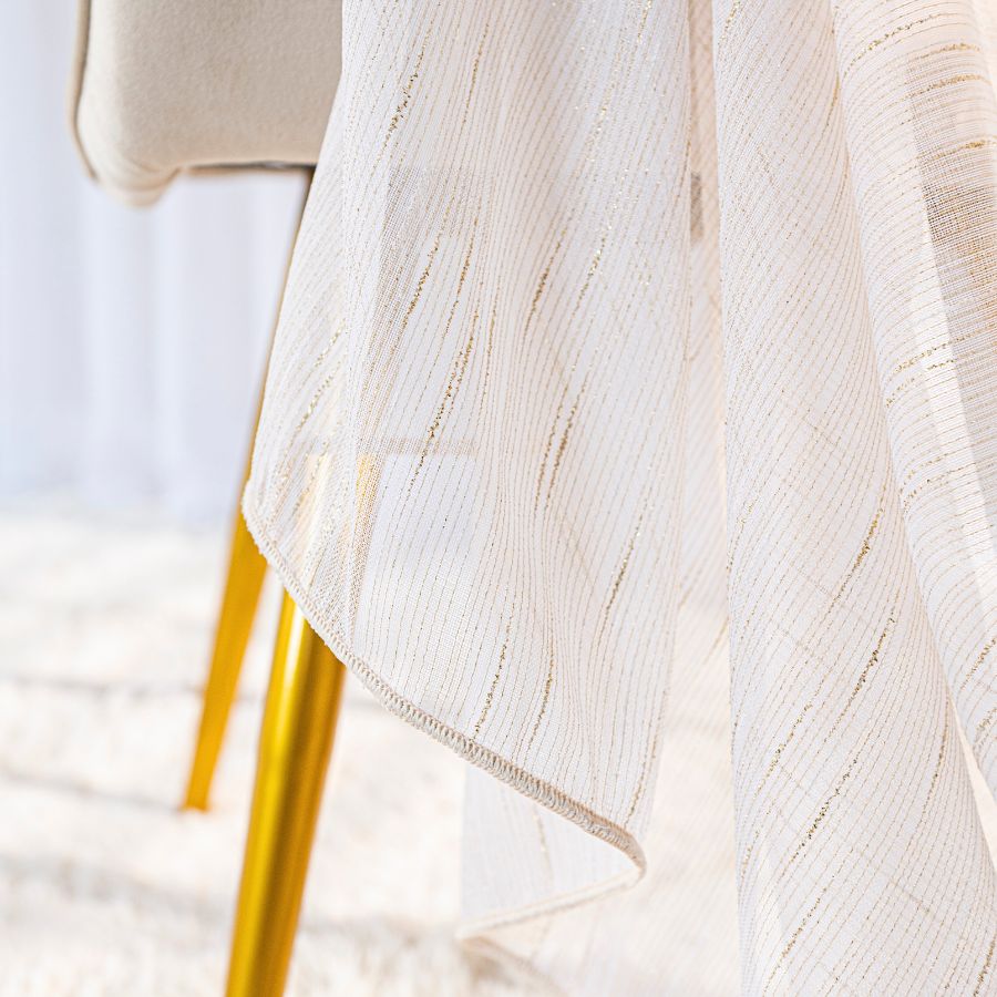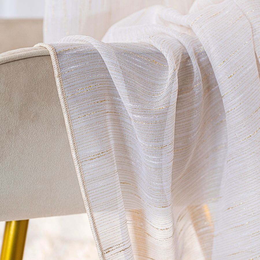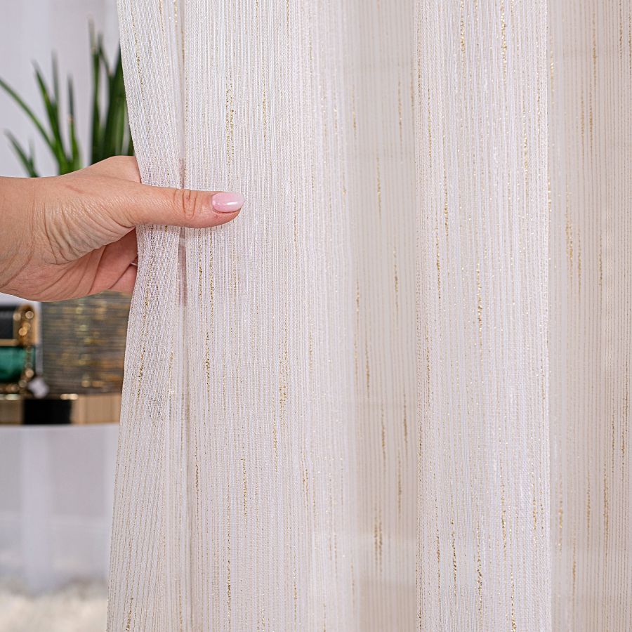 Ta nowoczesna firanka łączy w sobie lekkość kremowo-białej tkaniny z delikatnie połyskującymi, pionowymi nićmi w kolorze złota, wprowadzając do wnętrza subtelną elegancję i przytulny nastrój. Doskonale komponuje się zarówno ze stylem glamour jak i z nowoczesnym minimalizmem, w którym stanowić będzie ciepły, dekoracyjny akcent na tle stonowanych szarości czy beżu. W skandynawskich czy boho aranżacjach nada lekkości i naturalności, podkreślając drewniane elementy wyposażenia.