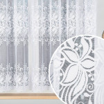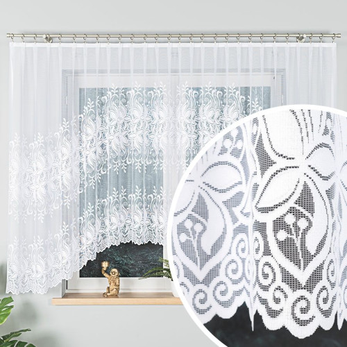 Gotowa krótka bogato zdobiona firana wykończona w łuk, kolor biały, oferowana w 2 rozmiarach, Joanna