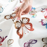 Wielobarwny nadruk z motylkami, umieszczony jednostronnie, ożywia pokój i działa stymulująco na wyobraźnię dziecka – to idealna dekoracja zarówno dla maluszka, jak i starszaka. Pastelowe tło i radosne kolory doskonale wpisują się w nowoczesne trendy aranżacyjne, wprowadzając do wnętrza lekkość, świeżość i dziecięcy urok.