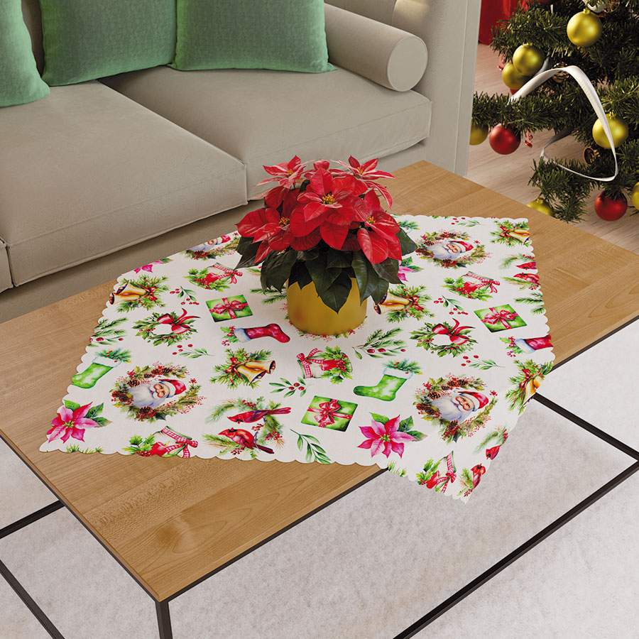 Wzór obrusa przedstawia kolorowe prezenty, które dodają mu wesołego ducha świąt, obok którego znajduje się piękny kwiat gwiazdy betlejemskiej, symbolizujący magię Bożego Narodzenia. Uśmiechnięty Święty Mikołaj i para ptaszków-kardynałków wprowadzają ciepło i świąteczny urok. Dzwoneczki na choince i gałązki jarzębiny dopełniają całość, tworząc harmonijną i pełną detali kompozycję.