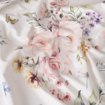 Poszewka zdobiona jest kolorowymi kwiatami, pośród których subtelnie pojawiają się ważki i motyle, tworząc harmonijną i pełną życia kompozycję. Pastelowo fioletowe tło doskonale podkreśla intensywne barwy kwiatów i owadów, nadając całości elegancji i spokoju.