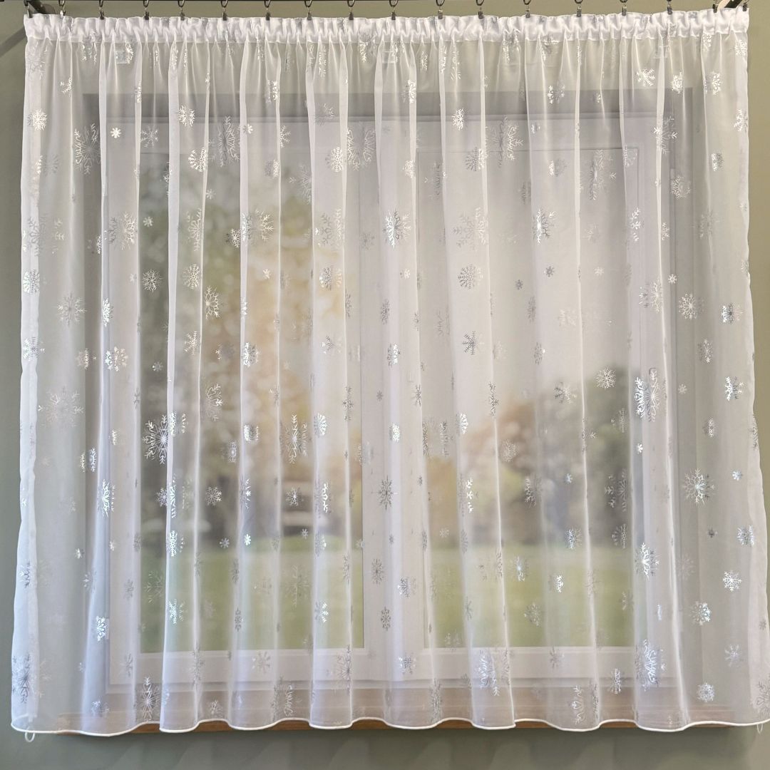Subtelny wzór złotych śnieżynek dodaje firanie elegancji i wyjątkowego charakteru, idealnie podkreślając klimat Bożego Narodzenia. Dzięki taśmie marszczącej firana układa się równo i estetycznie zaraz po zawieszeniu, bez konieczności dodatkowych poprawek. Dołem wykończona szwem obciążającym tzw. ołowianką.