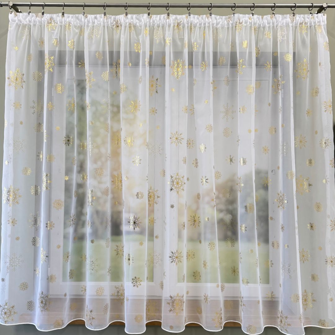 Świąteczna firana ze złotym nadrukiem – gotowa firana woalowa na taśmie marszczącej
