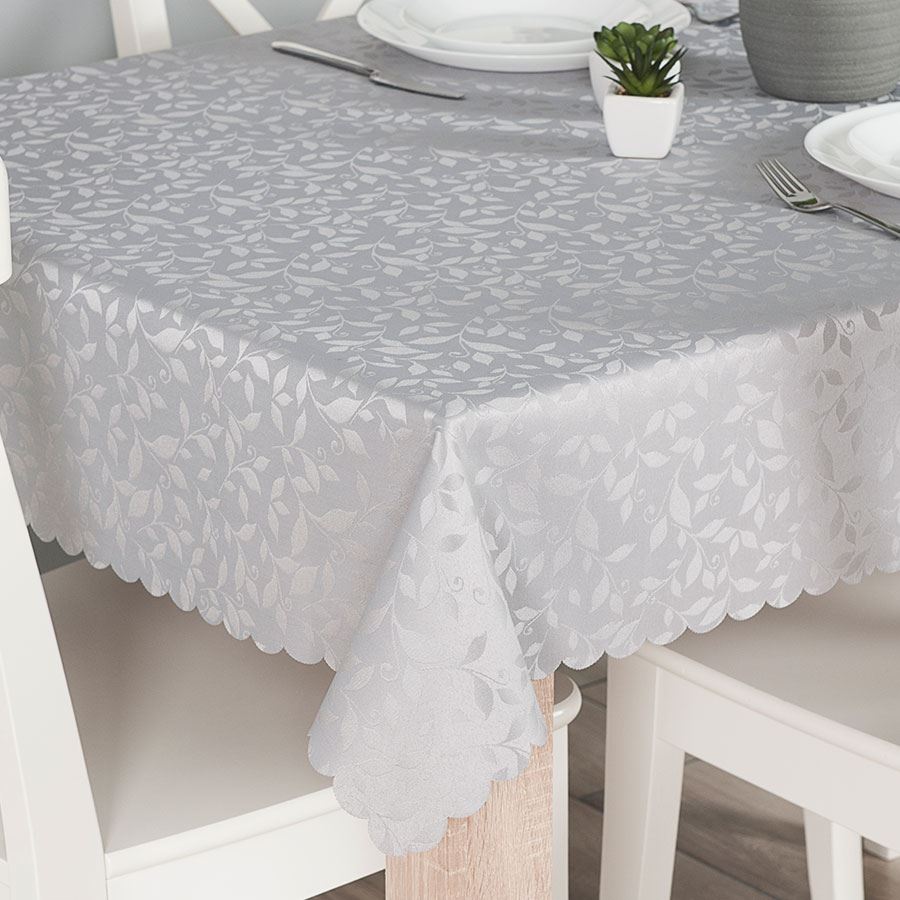 Jasnoszara tkanina obrusowa o roślinnym, połyskującym wzorze
