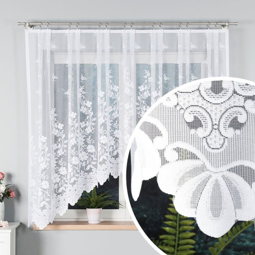 Krótki krój firany pięknie będzie prezentował się w pomieszczeniach takich jak kuchnia czy jadalnia. Cała tkanina udekorowana jest rosnącym, kwiatowym wzorem. Dół w postaci wyciętej łuku pięknie się układa i odświeża pomieszczenie, w którym firana zostanie zawieszona. Kwiatowa kompozycja przyciąga wzrok i sprawi, że Twoje wnętrze stanie się wyjątkowe. Tkanina przepuszcza dużo światła, co oznacza, że możesz zawiesić ją w pomieszczeniu nawet mocno zaciemnionym, bez obaw o brak światła we wnętrzu. Dzięki swojej białej barwie dopasuje się do każdego zestawienia kolorów.