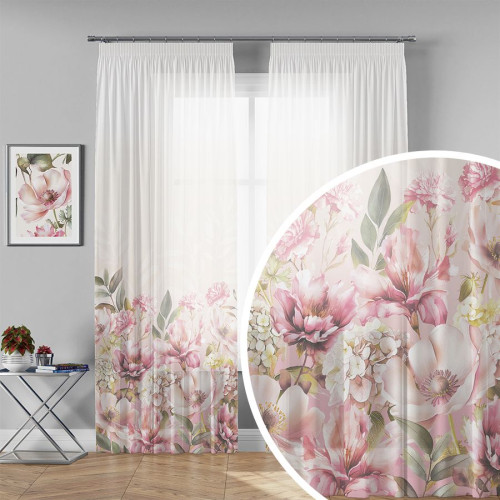 Zasłona dekoracyjna gotowa z woalu na taśmie z motywem różowych kwiatów, rozmiar 140x250 cm, Wera