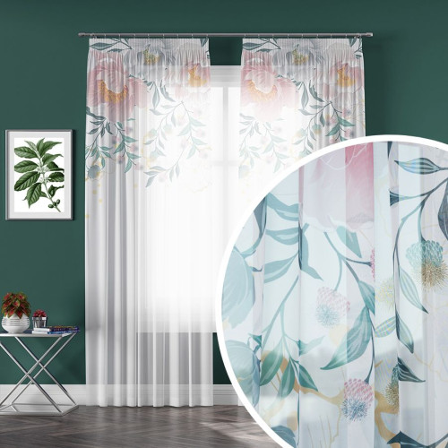 Zasłona dekoracyjna z woalu na taśmie z kwiatowym motywem w górnej części, kolor biały z różowym, rozmiar 140x250 cm, Flaura