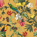 Wyjątkowo miękka i luksusowa tkanina o szerokości 150 cm wyróżnia się żółtym tłem, na którym mienią się kolorowe egzotyczne kwiaty i barwne ptaki, takie jak papugi i tukany. Taki wzór wprowadza do wnętrza odrobinę tropikalnego uroku i ożywia przestrzeń, czyniąc ją bardziej przytulną i unikalną.